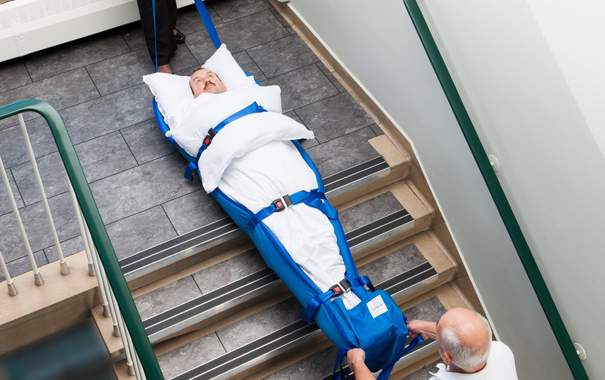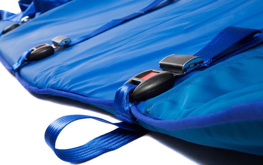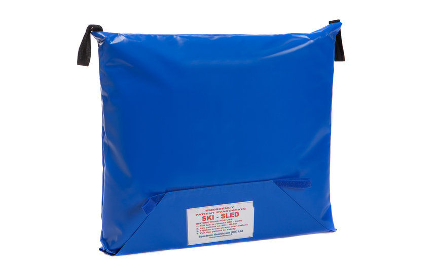 of the Ski Pad with a reinforced mattress and three aircraft seat style metal buckles. It is used throughout hospitals, care homes and schools amongst others. It evacuates patients where the Ski Sheet and bed mattress are too wide to be used through doorways or narrow corridors The Ski Sled has internal nylon support struts to provide added support. The Ski Sled comes in its own easy to open wall hanging bag. Safe Load tested to160 kg with a manufacturers advised limit of 120kg.